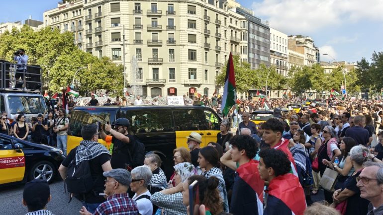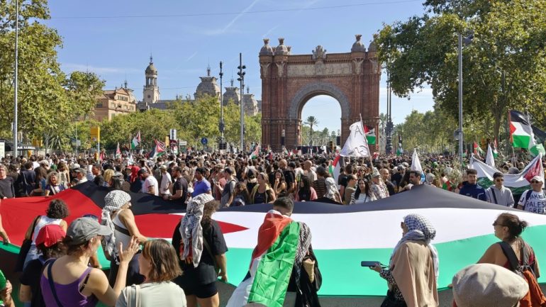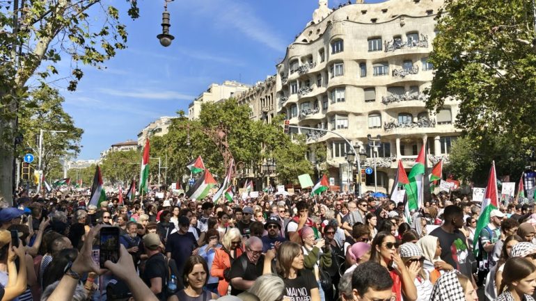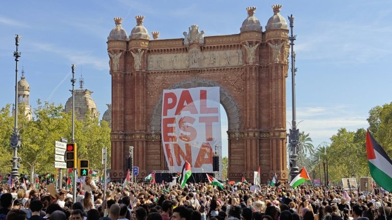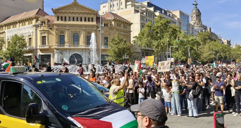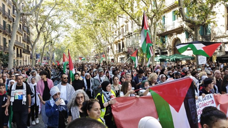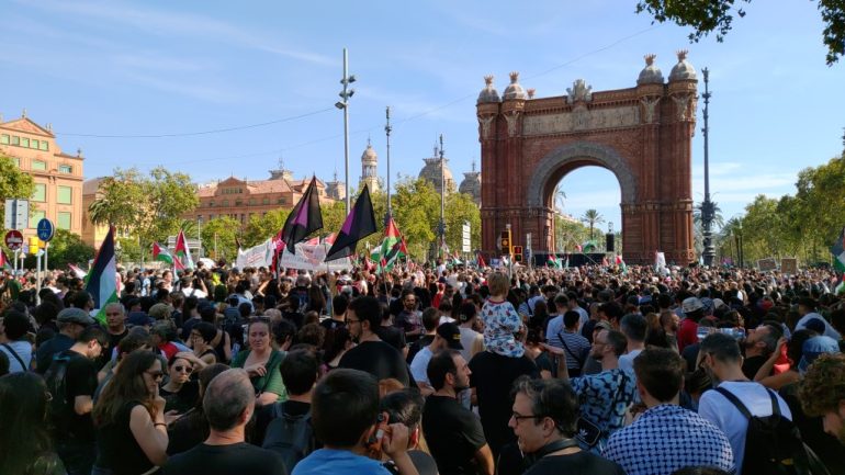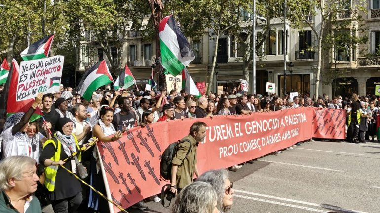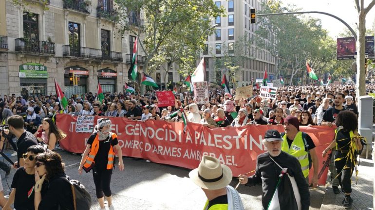 El dissabte 4 d’octubre, més de 300.000 persones (segons l’organització) i 70.000 (segons la Guàrdia Urbana) es van manifestar pel centre de Barcelona en contra del genocidi a Palestina, amb proclames com “Llibertat per Palestina”, “Boicot a Israel” i “des del riu fins el mar, Palestina lliure”. També, es va poder escoltar des del camió de la megafonia una adaptació de la cançó partisana ‘Bella Ciao’, himne de resistència, amb lletra en favor de la llibertat del poble palestí. S’han adherit al manifest 642 entitats i organitzacions i, des de diferents col·lectius, ja han convocat una vaga general el 15 d’octubre.