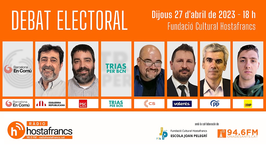 El proper 27 d’abril, dijous, a les 18 h, tindrà lloc el debat electoral que organitza Ràdio Hostafrancs amb motiu de les eleccions municipals del 28 de maig. Totes les formacions polítiques amb representació al Districte de Sants-Montjuïc durant els mandats 2019-2023 o 2015-2019 han estat convocades per l’Associació de la Ràdio Comunitària d’Hostafrancs i totes han confirmat la seva participació en aquest debat que es realitzarà en directe i de cara al públic a la sala d’actes de la Fundació Cultural Hostafrancs (Escola Joan Pelegrí), al carrer Torre d’en Damians, 6.