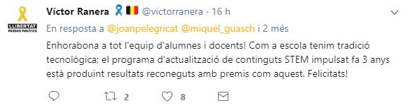 El director de l’escola, Víctor Ranera, ha felicitat públicament els premiats a través de Twitter recordant que el centre té tradició tecnològica i que fa tres anys va impulsar un programa d’actualització de continguts que “està produint resultats reconeguts amb premis com aquest”