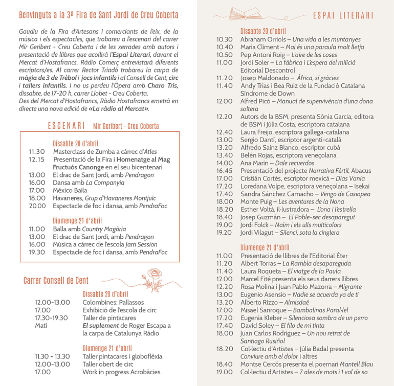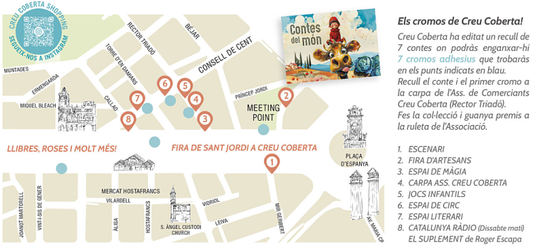 Els llibres i les roses estaran presents tant als pricipals carrers de l’eix comercial com a dins del Mercat. La llibreria Abacus munta una gran parada davant del Mercat d’Hostafrancs amb presència d’escriptors que signaran exemplars dels seus llibres. Catalunya Ràdio serà testimoni directe de tota aquesta activitat ja que el programa ‘El Suplement’, de Roger Escapa, s’emetrà en directe des del carrer de la Creu Coberta.