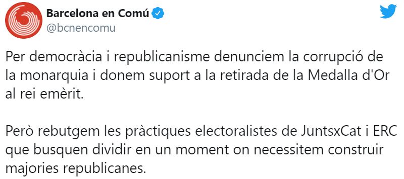 Des del seu compte oficial de Twitter, la formació de l’alcaldessa, Barcelona en Comú ha piulat el següent: “Per democràcia i republicanisme denunciem la corrupció de la monarquia i donem suport a la retirada de la Medalla d’Or al rei emèrit. Però rebutgem les pràctiques electoralistes de JuntsxCat i ERC que busquen dividir en un moment on necessitem construir majories republicanes”