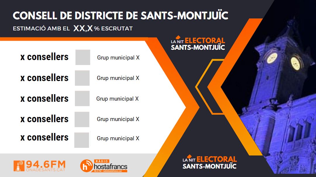 El programa especial ‘La nit electoral de Sants-Montjuïc’ que realitzen conjuntament Ona de Sants-Montjuïc i Ràdio Hostafrancs a partir de les 21h, presentarà una estimació actualitzada de com quedarà la composició del Consell Municipal de Districte de Sants-Montjuïc, a mesura que avanci el recompte.