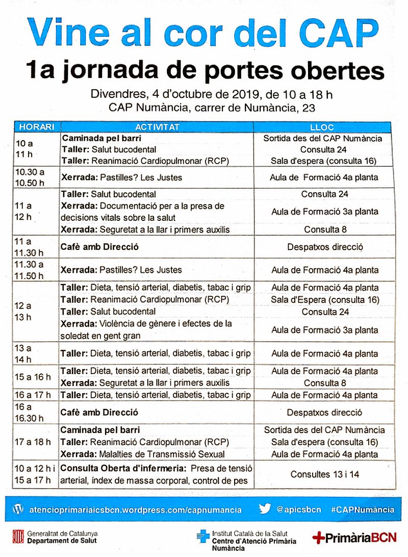 Divendres 4 d’octubre, per primera vegada, el CAP Numància, organitza una jornada de portes obertes que permetrà a la ciutadania no només conèixer a fons els serveis del centre sinó també participar en diverses activitats dirigides a la prevenció, la promoció d’hàbits saludables i la millora de la salut comunitària.