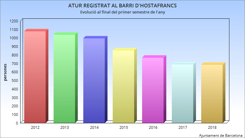 L’atur registrat en els darrers anys no ha deixat disminuir tant al conjunt De Catalunya, com a la ciutat de Barcelona, al districte de Sants-Montjuïc i al barri d’Hostafrancs des de 2012 que és l’any en el qual es van assolir les xifres més altes. En acabar el primer semestre de 2012, hi havia 1.077 persones del barri que buscaven feina i que constaven a les llistes del Servei d’Ocupació de la Generalitat. Aquesta xifra s’ha reduït un 36,49%, si la comparem amb les dades de finals de juliol d’enguany.