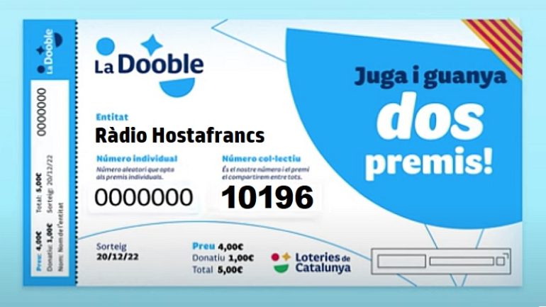 El 10196, el número de Ràdio Hostafrancs, ha obtingut un reintegrament de 4 euros en el sorteig de La Dooble, el nou sorteig de Loteries de Catalunya que s’ha estrenat aquest dimarts 20 de desembre. En aquesta nova loteria, destinada a ajudar a les entitats han obtingut reintegrament tots els números col·lectius acabats en 6.