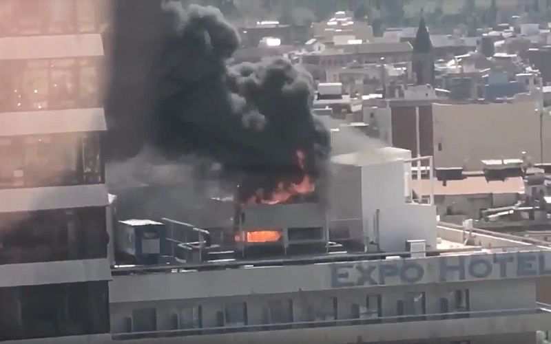 Ensurt, una gran fumera, desallotjament preventiu d’unes 300 persones, enrenou i, afortunadament cap persona afectada, són les conseqüències de l’incendi que s’ha produït aquest dimecres al migdia a la coberta de l’ExpoHotel, al carrer Mallorca entre Tarragona i Rector Triadó, molt a prop de l’estació de Sants. El foc s’ha declarat pocs minuts abans de les 13 h per causes que els Bombers investiguen i que podrien estar en una guspira perquè al terrat de l’edifici hi havia operaris treballant amb una màquina de soldar. L’incendi s’ha extingit en pocs minuts després que hi hagin treballat una desena de dotacions de Bombers.