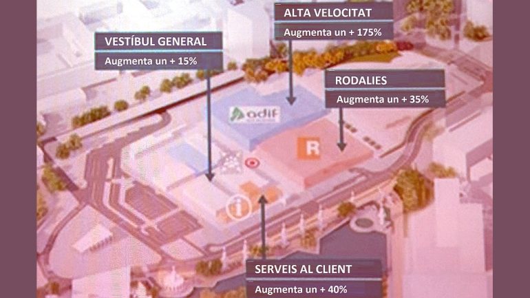 L’obra que té un gruix més important és l’ampliació i reforma de l’edifici de l’estació. Són 38 mesos d’obra, amb l’horitzó d’acabar aquesta fase l’any 2028. El resultat de l’ampliació serà un agument del 175% de l’espai per viatgers d’alta velocitat, un 35% més de superfície destinada a Rodalies i un 15% més de zona de vestíbul general.