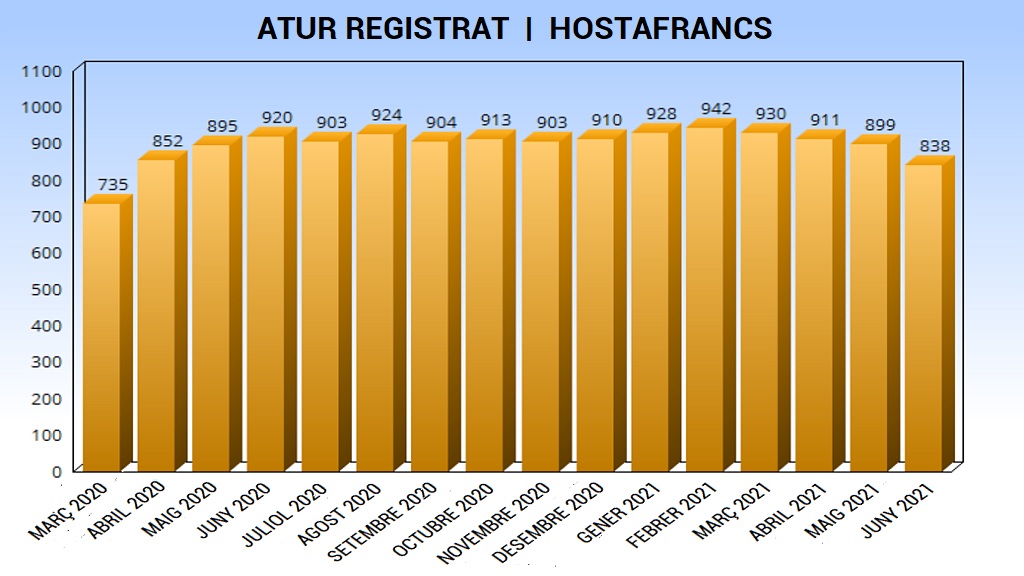 Les dades d’atur registrat corresponents al barri d’Hostafrancs apunten una recuperació lenta dels nivells d’ocupació laboral. La situació està encara lluny de la que hi havia el mes de març de 2020, en el moment en que es va declarar l’alerta sanitària pel coronavirus i es va decretar el confinament total i l’aturada de l’economia. La primera meitat d’aquest any 2021, a 30 de juny, es va tancar amb la xifra de 838 persones residents a Hostafrancs i registrades a les oficines del Servei Català d’Ocupació per intentar trobar una feina. A data del 30 de març de 2020, les persones aturades a Hostafrancs eren 735.