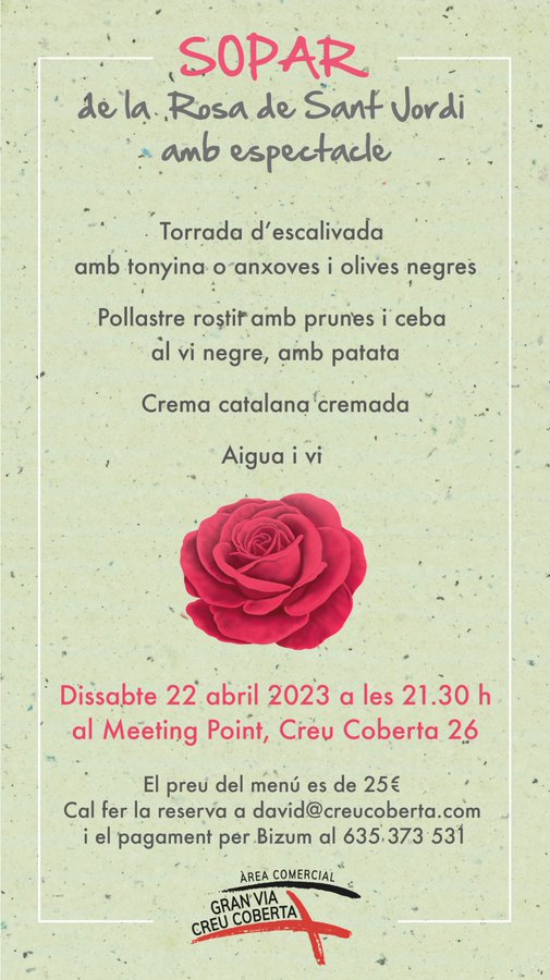 En el marc de la Fira de Sant Jordi, l’Associació de Comerciants Creu Coberta, ha organitzat una revetlla gastronòmica i cultural al Meeting Point (c. Creu Coberta, 26) Un sopar amb espectacle que tindrà lloc dissabte 22 d’abril a partir de les 21.30 h amb el menú següent:
