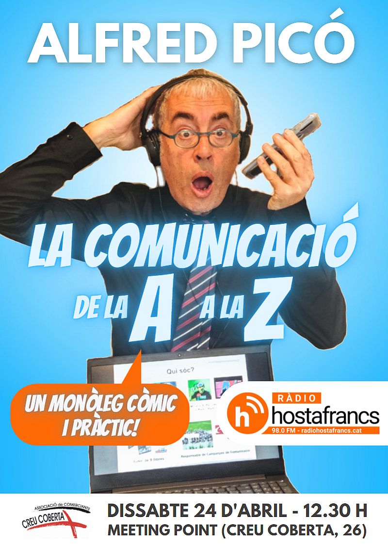 - A les 12.30 h ‘La comunicació de la A a la Z’, monòleg en clau d’humor a càrrec de l’escriptor i periodista hostafranquí Alfred Picó. Aquest acte, organitzat per Ràdio Hostafrancs, es farà a l’escenari del Meeting Point.