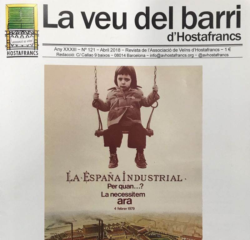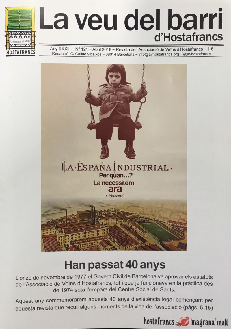La revista ‘La veu del barri’, editada per l’Associació de Veïns d’Hostafrancs, ha sortit aquest mes d’abril amb un número extraordinari dedicat al 40è aniversari de la legalització de l’entitat veïnal. La publicació recorda els més de 40 anys d’història de l’associació i algunes de les lluites veïnals del temps de la transició, com el rebuig al pla comarcal que suposava trinxar el barri, el clam per convertir l’antiga fàbrica de l’Espanya Industrial en un espai públic o la recuperació del Casinet d’Hostafrancs.